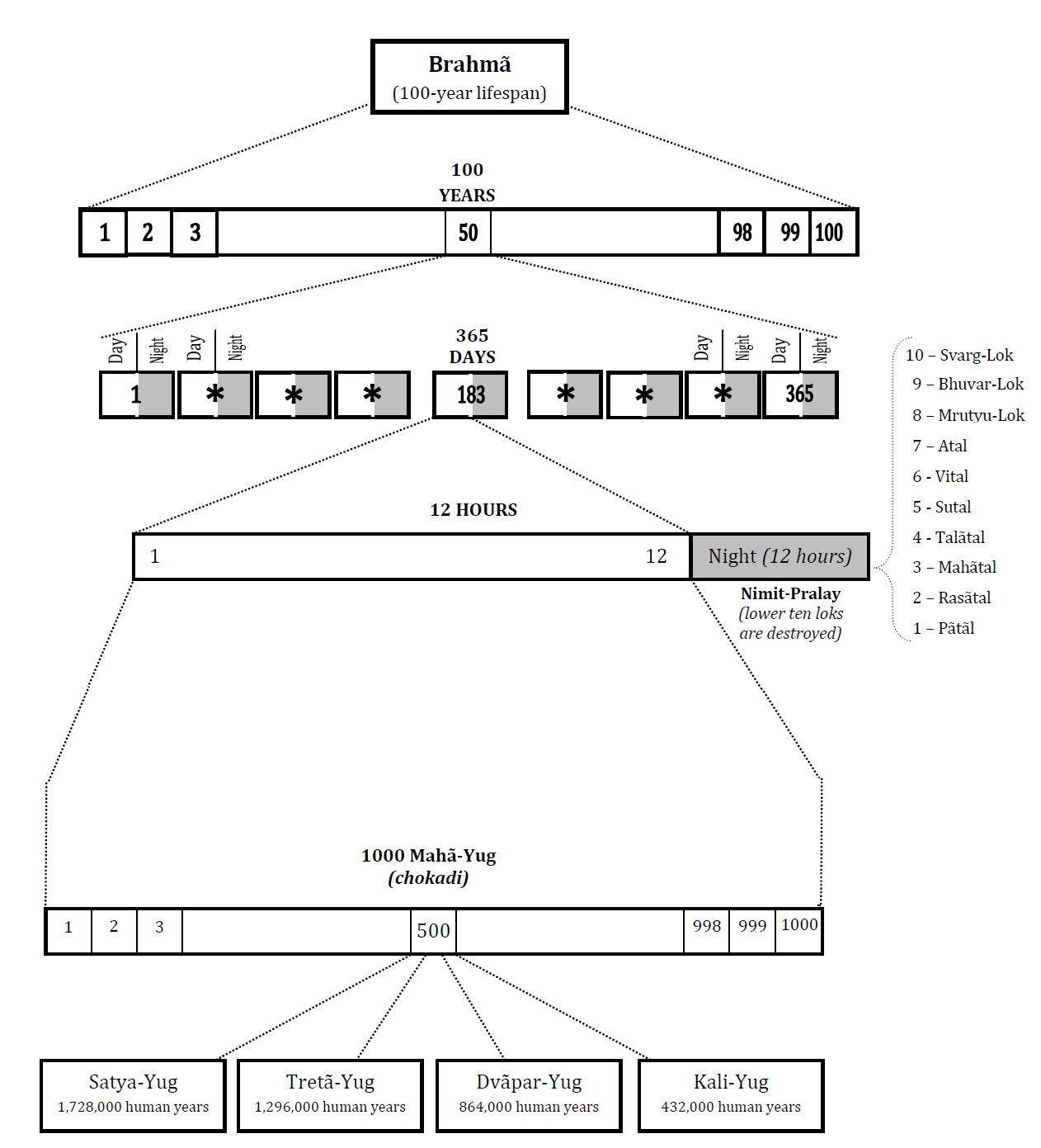 Time is measured at a scale that is far beyond our imagination, and much greater than the time that is measured on earth. The calculation for this measurement is stated in the shãstras. It has been simplified into the diagram below which makes it easier to understand.